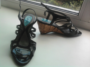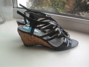 5. чёрные лакированные босоножки на пробковой танкетке, одевала один раз, новые, размер 38 - 400 рублей.