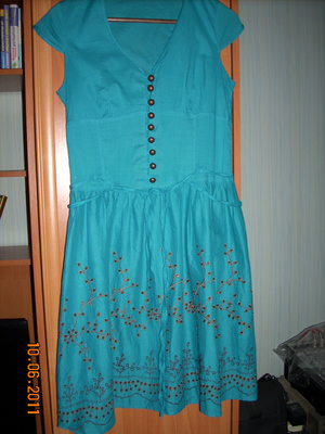 Очень легкое платье, невесомое, хлопок 100%. Одевалось всего пару раз, мне маловато. Размер скорее на 44.