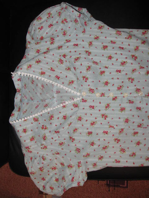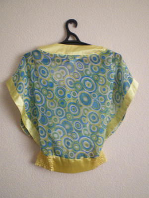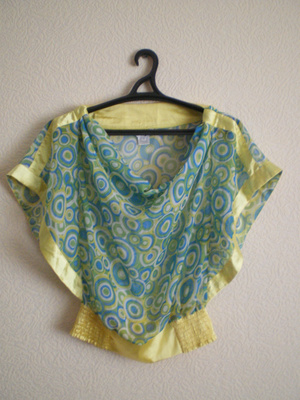 Продам летнюю кофточку р-р М. Одета 1 раз. Решила, что эта вещь всё-таки не для меня. На этикетке написано, что кофточка из шелка, я полагаю, что это всё же шифон, за счет рисунка ткань просвечивает совсем немного. Спереди вырез "качели", рукава "летучая мышь", снизу мягкая резинка. Можно носить на одно плечо.