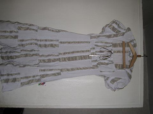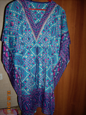 Туника, привезена в подарок, не носила. Регулируется вшитым пояском под грудью, так что можно сказать безразмерная. На пляж или дома.