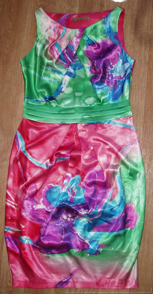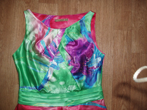 Неземной красоты шелковое платье Perletti, расписанное, если не ошибаюсь, в технике "батик". Все просто светится. Классный фасон - типа присборенного "футляра", юбка слегка тюльпаном, на груди складки, визуально ее увеличивающие, отлично садится. На грудь максимум 2, талия до 65, бедра до 94. Надевала ровно 1 раз прошлым летом, к огромному сожалению, мне не идет расцветка. Покупала очень дорого, отдам за 2200, реальному покупателю небольшой торг. Платье -настоящий эксклюзив, внимание окружающий обеспечено!:)