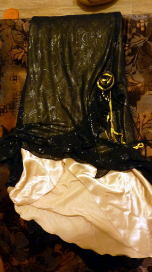 2. вечернее/выпускное платье. Двуслойное. материал не помню. Низ золотистый, верх черный немного прозрачный с серебристыми цветами. Сбоку принт в виде золотого цветка из пайеток. Ворот можно заправить внутрь или сделать качелькой. Р.42-44 = 700 руб.