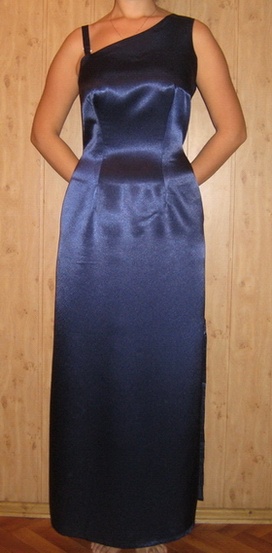 Платье атласное синее. Ассиметричные лямки. Разрез внизу и замочек через всю спинку. Приталенное. Размер 46-48. Цена 650 руб.