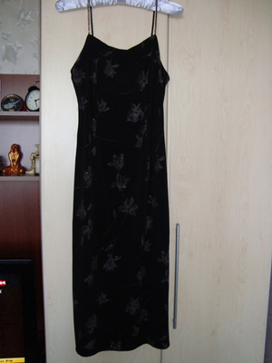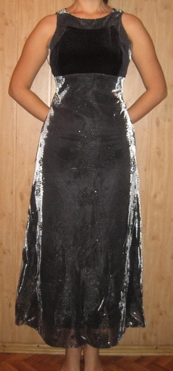 Праздничное платье из салона "Фавиана". На груди черный бархат-стрейч, Приталенное, черный подклад, сверху серебряная ткань с набивными черными бархатными цветами. Замок через всю спинку. Размер 46-48. Цена 1 600 (покупалось гораздо дороже). Одевалось 1 раз на НГ.