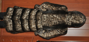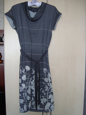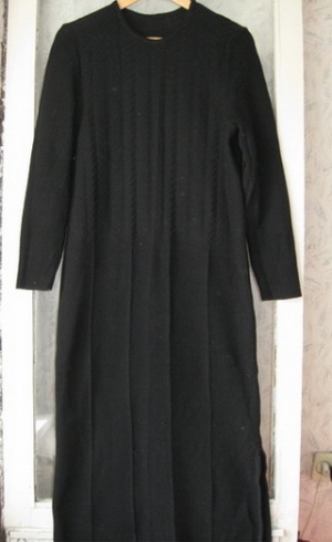 Черное теплое платье, с разрезм сбоку, в красивые узоры. Белорусское. Состав 30 %-шерсть. 70 % - синтетика. На рост от 164 до 178 см. К нему прилагается металлический серебристый пояс.Платье идет по фигуре, на фото этого не видно. Размер 48-50. Цена -600 руб.