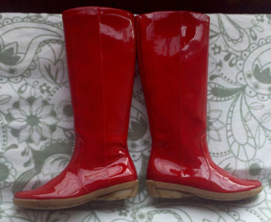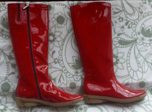 Новые сапоги марки Aquatalia by Marvin K. Материал - нечто запатентованное синтетическое) в общем не кожа! Не пропускают воду, в описании были как альтернатива резиновым сапогам, заказывала в сша. Лакированные. Цвет в реалии ярко алый. Размер 36.5 - 37 (американский размер 7), на узкую ножку. Высота каблука около 2.5 - 3см. Мне малы. Цена 2 800 руб.