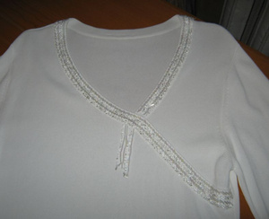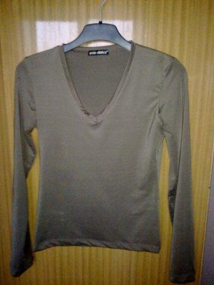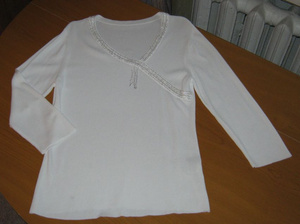 вот такая трикотажная кофточка, тут наоборот она мне слишком велика, нужен 46 с грудью ,а может и 46-48, рукав 3/4 , симпатичная отделка бисером