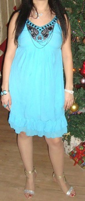 1. Платье небесно-голубого цвета, шифон, одевала на корпоратив, была в положении, скрадывает небольшой и большой животик за счет покроя, разброс размера от 44 до 48, 700р (покупала за 1250р)
