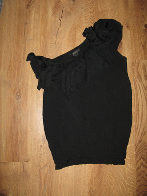 Очень красивый топ Mango (Mango Suit), если память не изменяет, какая-то там лимитированная коллекция от Пенелопы Круз, в общем, мне привозили его из Испании, долго пыталась его приспособить, но не идет мне фасон на одно плечо, как ни крути. Что очень жаль, потому что топ суперский. Тянется, украшен розой и рюшами из того же материала, смотрится очень дорого и необычно. 42-44, возможно, и на 40 подойдет, или на небольшой 46. 1000 рублей, мне в свое время обошелся вообще дорого. Фото красоты не передает почти, так как он насыщенно -черной, сложно сфотать. Если что, есть еще фото
