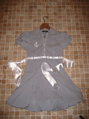 платье в морском стиле (можно носить при не жестком дресс-коде в офис) размер 42 (можно 40-44) длина 88 см., талия 70 см. (сзади поясок, талия чуть-чуть завышена, что визуально удлиняет ноги при таком фасоне не делая вас чуть-чуть беременной, юбка на подъбнике-тульпан с кляньями, сбоку плательный замок. Б-у пару раз, цена 650 руб.