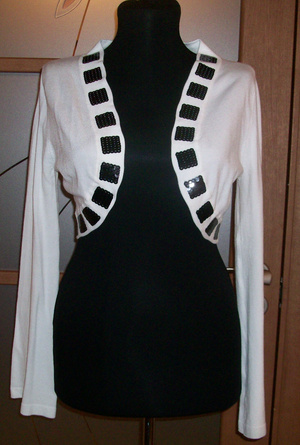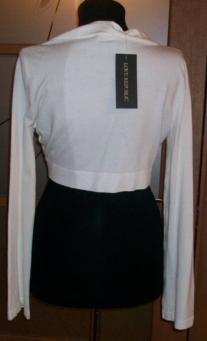 Симпатичный жакетик-болеро. Белый с черной отделкой пайетками. Мягкая приятная ткань, тянется. предполагаю, что должен быть, тепленьким. LOVE REPUBLIC. Новый с этикетками. Производитель указал: рост 170, 88 см грудь. Но это трикотаж, поэтому размер может быть и 42-44 и 44-46. Покупала здесь, на форуме, к конкретному платью. Мне не подошел. 500 рублей.