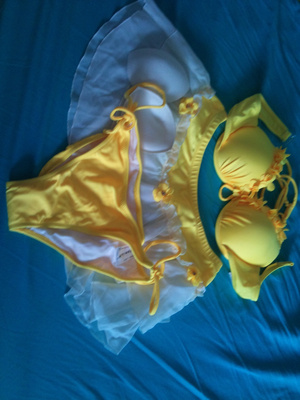 ярко желтый, мне малой в груди, заказывала через интернет, очень классный и оригинальный, бюстик на паралоне, есть дополнительные вставки пуш-ап, в комплекте есть юбочка