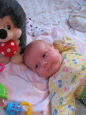 мы хорошо держим голову, переворачиваемся с живота на бок и спину, поднимаем плечики лежа на животе на ручках, сосредотачиваем и удерживаем взгляд на маме, папе, игрухах, мобиле. Появился "комплекс оживления", если радуется, начинает махать руками-ногами, улыбаться, гулить (уу, гуу, гии, иногда агу