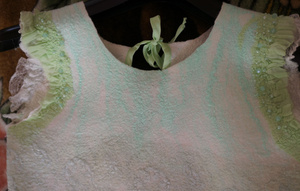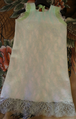 Вот, вроде получилось передать цвет... Не знаю, видно ли хорошо, он зеленоватый, с разводами, от холодного какого-то салатового, до тепло-мятного... И кружево - тоже зеленоватое, не белое...