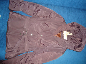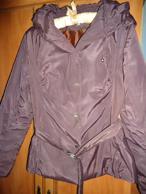 1. Куртка на теплую осень. Б/у. Цвет между коричневым и бакалажаном. Не блестит! Капюшон. Приталенная, хорошо смотрится с юбкой. 46 размер. 400 руб.