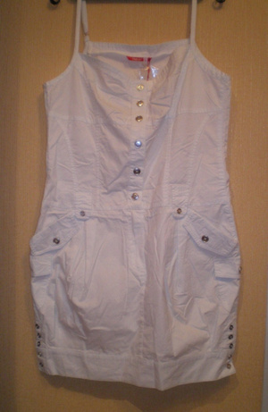 Два сарафанчика из СП черный размер - M, белый - L, фирма Пеликан. На фото на мне размер S, ремень мой. Хорошего качества, 100% хлопок. Лямочки регулируются, сзади два накладных кармашка.