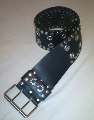 Натуральная кожа черного цвета, пряжка и декоративные заклепки – металл белого цвета.