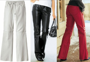 Брюки кожаные, новые, Германия, очень высокого качества, плотные, на подкладе, длины хватает до роста 180 см ( пошаговый 88-89 см), талия чуть занижена, от колена легкий клеш, очень оригинальный покрой по косой под коленками, оригинально обработанные швы наружу. красные!!! размер 48( может даже 46/48)