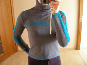 5. ОРИГИНАЛЬНЫЙ ТЕПЛЫЙ ДЖЕМПЕР СЕРЫЙ С БИРЮЗОВЫМИ ПОЛОСКАМИ, СОСТОЯНИЕ Б/У, 199 Р.