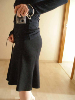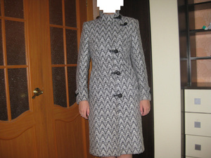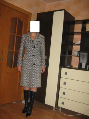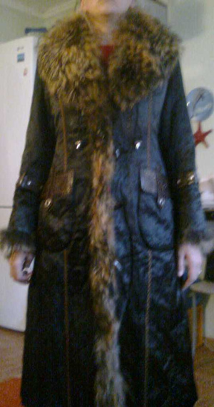 Длинный (немного выше щиколоток при росте 167) черный плащ, на 42-44 размер. Застежка на мелких кнопках, пояс. Очень необычная модель: до талии - узкая, по фигуре, ниже талии - плащ как пышная юбка, с защипами и кулисами с разных сторон. К сожалению, пока нет фото. Посмотреть можно на пл. К Маркса или на пл. Ленина. Цена 2 000 руб.