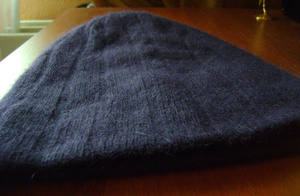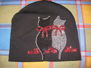 Шапочка черная на флисе (на осень), рисунок-кошечки из страз, утеряно несколько страз (думаю, что легко восстановить), 300 руб
