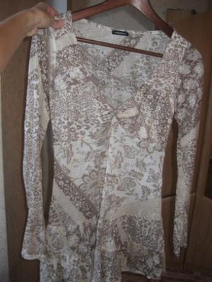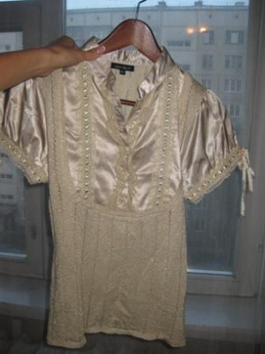 Нарядная кофточка из легкой, но прочной, почти прозрачной ткани, со вставкой на груди, чтоб не просвечивало, глубокое декольте,по декольте пайетки, длинные ассиметричные рукава, внизу у кофты сбоку завязывается интересный узелок. Размер 46-48. Цена 400 руб.