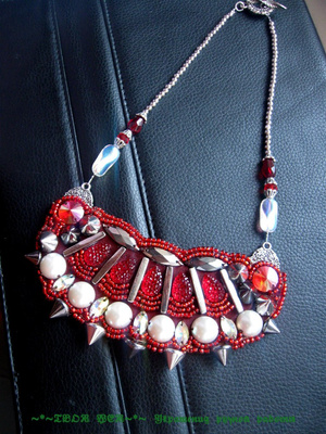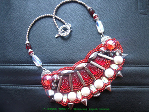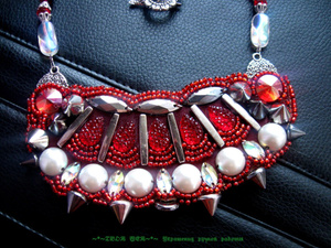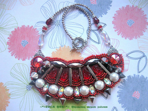 Шикарное колье с изумительным сиянием страз, бисера. Добавлены модные металлические детали- шипы и длинные бусины-трубочки. В единственном экземпляре. Авторская работа.