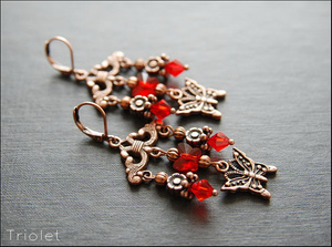 1. Серьги "Красные бабочки". Кристаллы-бабочки Сваровски, кристаллы Preciosa, медная фурнитура. Длина от швензы 5 см. Цена 500 руб.