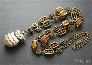 Кварцевые часы-кулон (батарейку можно менять, циферблат открывается при нажатии на ушки совы), кубики-лэмпворк с омедненными ребрами и цветными полосками внутри стекла (Чехия), кристаллы Сваровски Crystal copper. Длина 80 см.