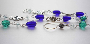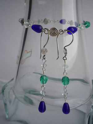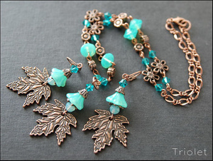 2. Комплект "Кленовые листья". Чешское стекло, кристаллы Сваровски цветов Pacific оpal и Blue zircon. Длина цепочки 45 см, серьги от швензы - 5 см. Цена 950 руб.