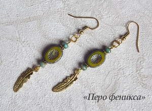 3. Серьги "Перо феникса". Овальные бусины с рельефным рисунком в стиле picasso, граненые бусины формы donats, металлические подвески-перышки. 350 руб.