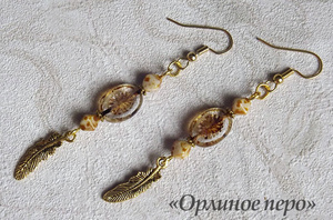 1. Серьги "Орлиное перо". Овальные бусины с рельефным рисунком в стиле picasso, бусины с покрытием travertin, металлические подвески-перышки. 350 руб.
