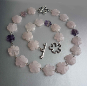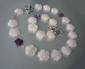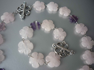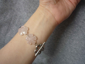Изысканность бусин-цветочков из розового кварца удачно дополняют и подчеркивают посербренные замочки-тогглы, также выполненые в виде цветов.