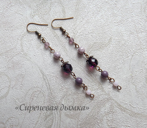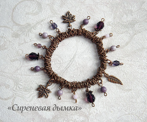 13. Комплект "Сиреневая дымка" (браслет+серьги). Оригинальный растягивающийся браслет, чешское стекло, металлические подвески-листья под медь. 600 руб.