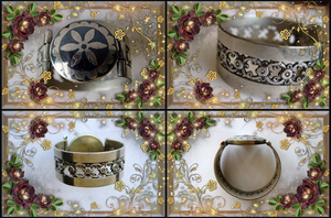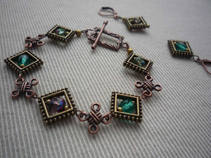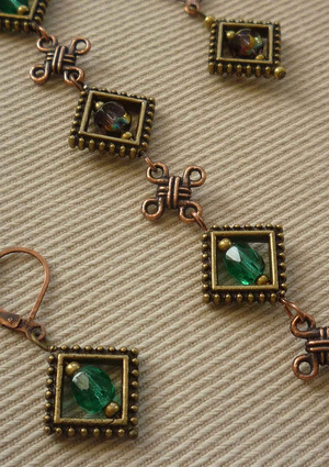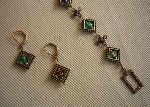 Винтажную гамму этих бижу подчеркивает медное обрамление.
