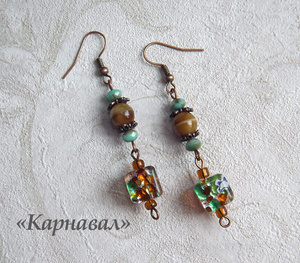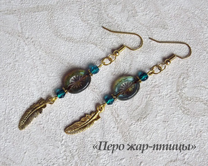 2. Серьги "Перо жар-птицы". Овальные бусины с рельефным рисунком в стиле picasso, чешское стекло, металлические подвески-перышки. 350 руб.