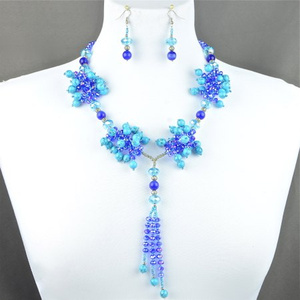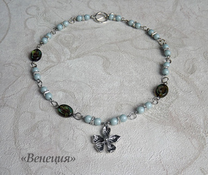 5. Комплект "Венеция" (колье+серьги). Нежные серебристо-голубые стеклянные бусины, овальные бусины с рельефным рисунком в стиле picasso, стразы и изящная подвеска в виде цветка. 700 руб.