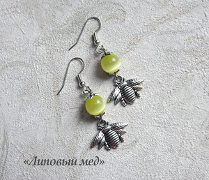 7. Серьги "Липовый мед". "Кошачий" глаз, металлические подвески-пчелки. 200 руб.