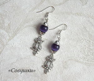 9. Серьги "Совушки". "Кошачий" глаз, металлические подвески-совы. 200 руб.