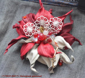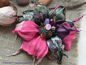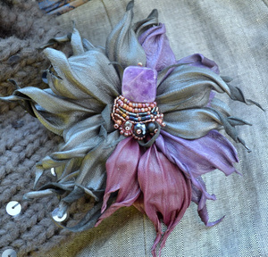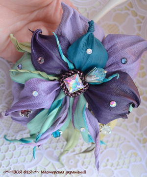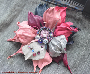 3. Брошь-зажим "Цветок фуксии" из натуральной замши и кожи. Очень красивая и нарядная, не очень крупная. В серединке- розовый кварц, аметист, жемчуг, чешское стекло, чешский бисер. Цена 1400 рублей.