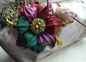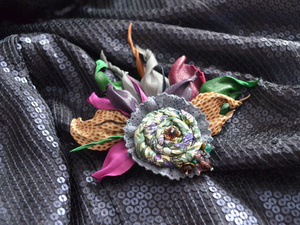 1. Брошь- зажим "Маленькие радости)" из итальянской кожи и велюра, красивые глубокие цвета, яркая искристая серединка вышита чешским и японским бисером. Цена 1450 рублей.