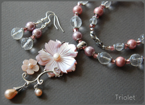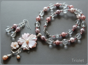 Натуральный резной перламутр, жемчуг майорка, горный хрусталь.