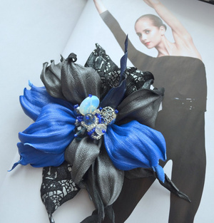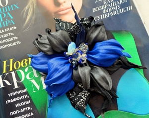 Брошь-зажим в сдержанных сине- серых тонах. Использована натуральная итальянская кожи и замша с кружевным принтом. В серединке-лунный камень, хрустальные бусины и бисер. Цена 1200 рублей.