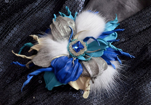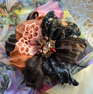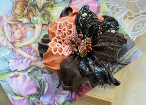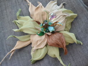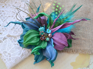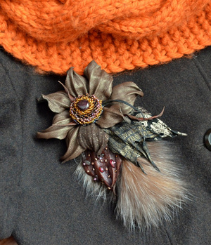 Брошь выполнена из натуральной итальянской кожи и замши, хрустальных бусин, перьев, медной фурнитуры. Двойное крепление- булавка и зажим, можно использовать для украшения прически. Цена 1400 рублей.