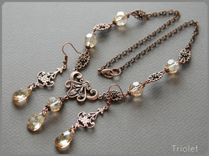 Кристаллы Swarovski цвета Golden Shadow, винтажная фурнитура Trinity Brass Co (США). Длина серег от швензы 4,7 см, длина колье 43 см (могу скорректировать), высота центрального элемента 6 см.