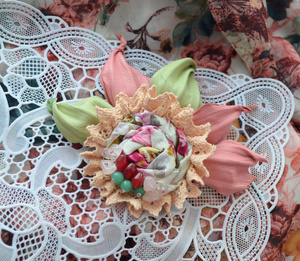 Брошь-цветок "Весенние цветы" из коллекции "Сказочная весна 2014". Выполнена из натуральной итальянской кожи, американского хлопка, хлопкового кружева, чешского стекла, хрустальных бусин и бронзовой фурнитуры. Цена 1350 рублей.