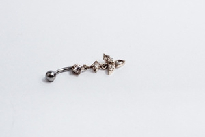 - Пирсинг для пупка. 350 руб., серебро. Декорирован прозрачными фианитами и небольшой подвеской, оканчивающейся трехлепестковым цветком. Лёгкая и по весу, и по восприятию конструкция смотрится аккуратно и, в то же время, достаточно интересно.