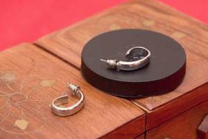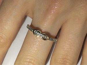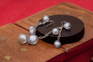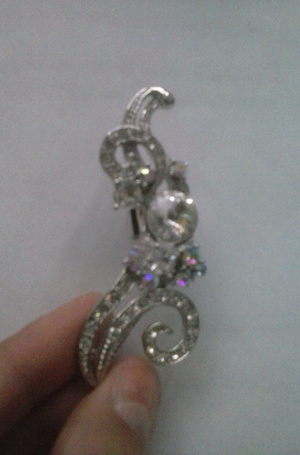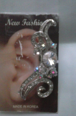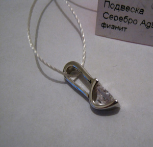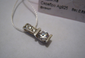Материал - серебро, декорирован прозрачными фианитами и небольшой подвеской, оканчивающейся трехлепестковым цветком. 350 руб.
