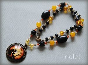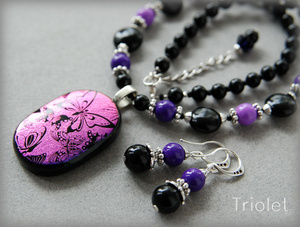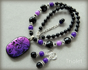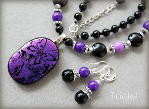 Кулон с верхним слоем из дихроического стекла (меняет оттенок при разном угле зрения), черные агаты, цветное стекло с покрытием эмалью.