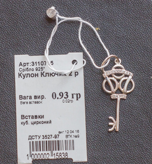Кулон-ключик. Новый, с пломбой. Материал - серебро, вставки - цирконий. Длина 23 мм.